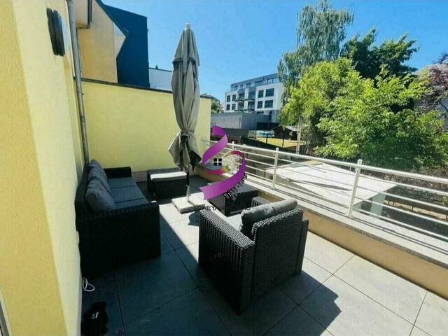 – Premier étage : cuisine équipée et ouverte, grand living lumineux de 59 m² avec balcon de 17 m², WC séparé